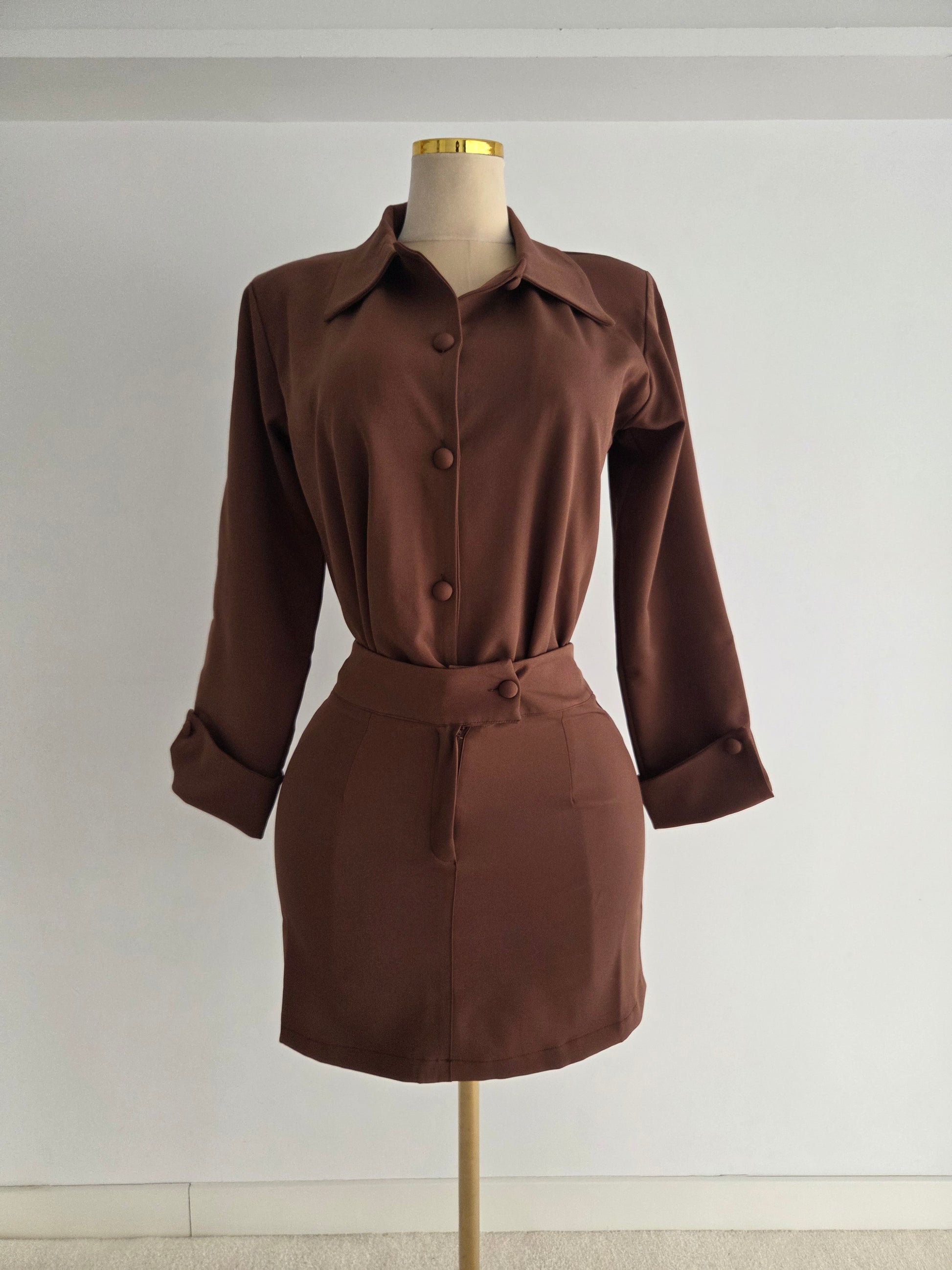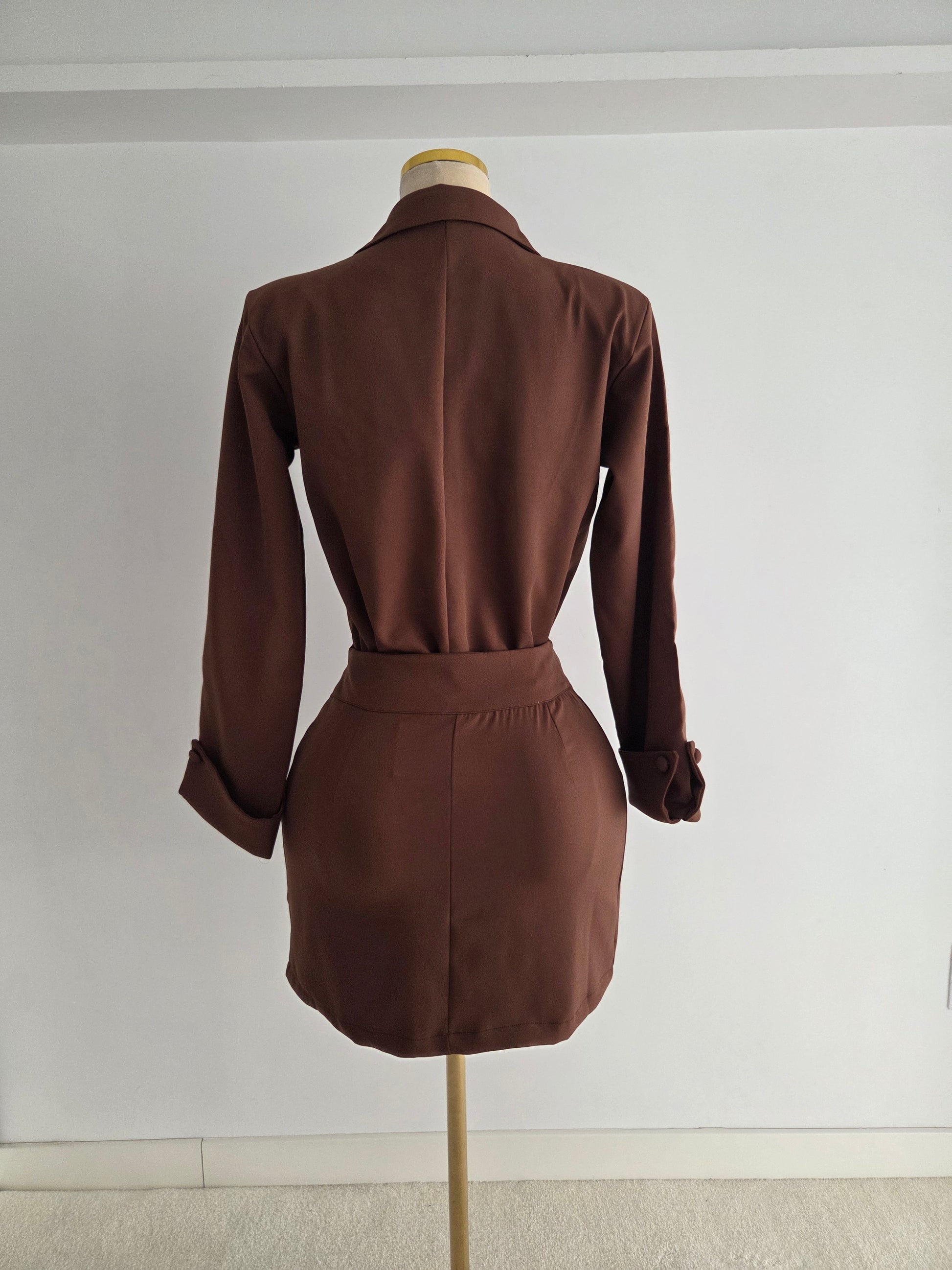 Este traje de dos piezas en color marrón es la definición de elegancia moderna.
