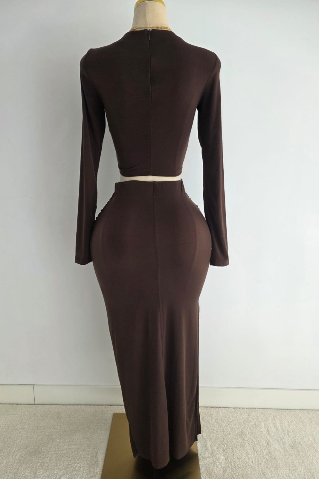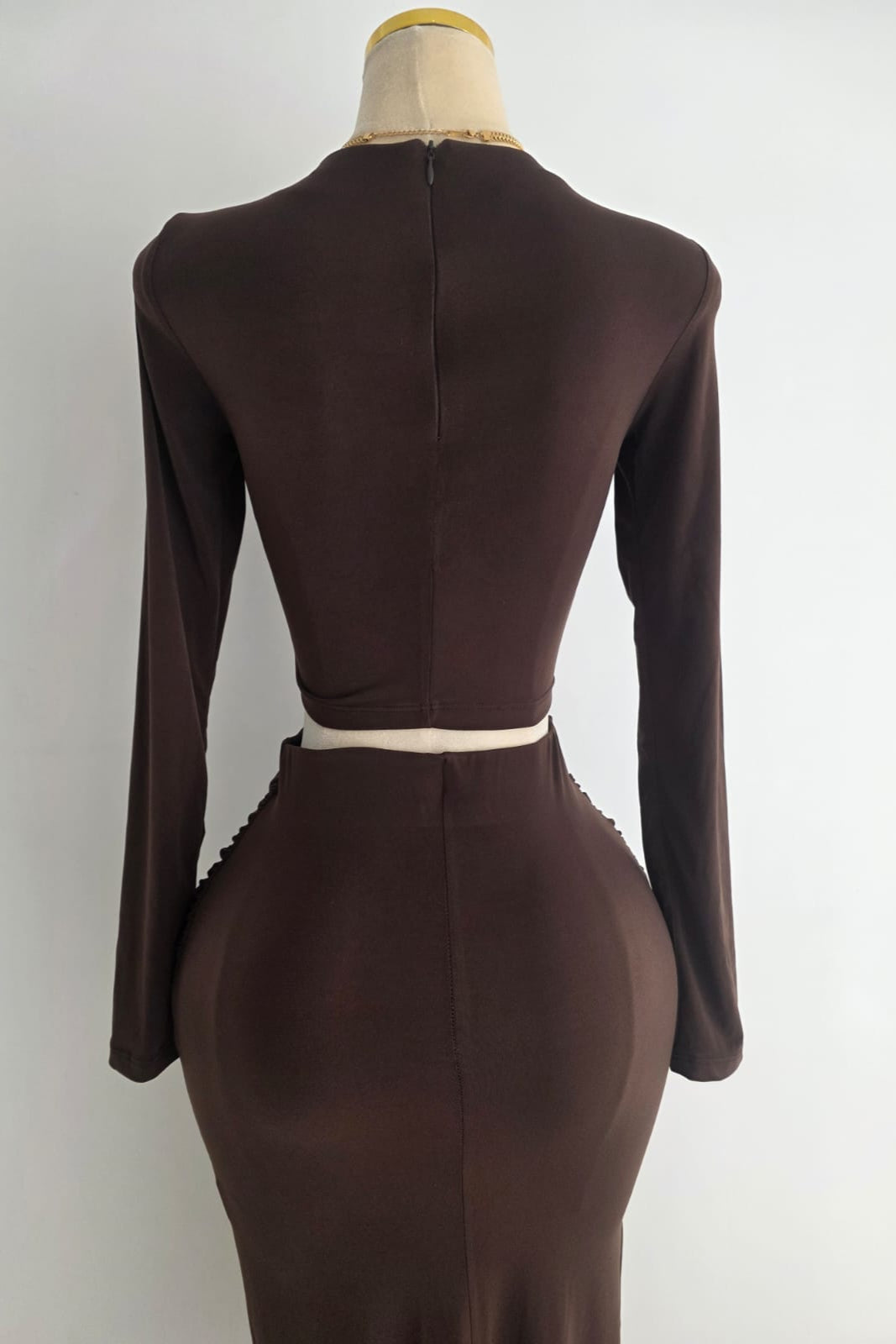 Serás el centro de atención de todas las miradas con nuestro conjunto de dos piezas en color marrón chocolate, confeccionado en licra elástica de alta calidad que se adapta a la silueta con un ajuste perfecto.