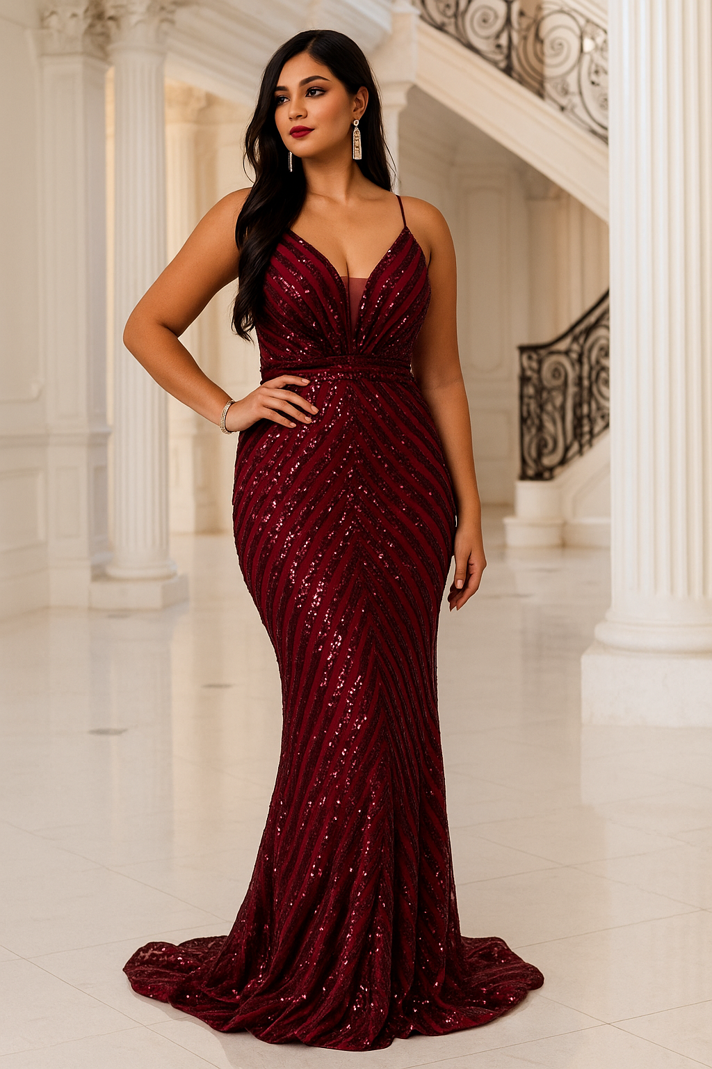 Serás la atención de todas las miradas en tu próximo evento con este vestido largo burdeos de lentejuelas, diseñado para realzar la silueta femenina con un corte ajustado y cómodo.