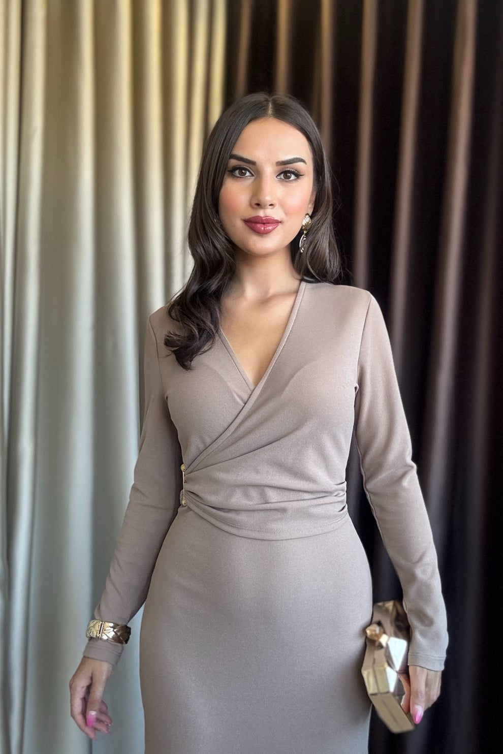 Este vestido midi en color visón es pura elegancia en estado suave. Su tono neutro y sofisticado realza la piel y combina con una facilidad increíble, mientras que los detalles dorados añaden un brillo delicado y femenino que ilumina todo el diseño.